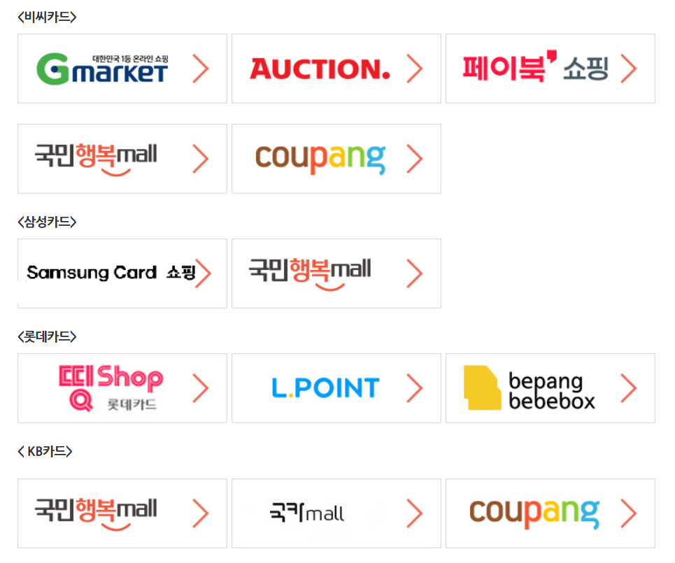 - ※ 카드사 별 구매처가 다름에 유의(정부는 이용자 편의를 위해 구매처 확대를 계속 추진 중이며, 확대 시 별도 안내 예정임)